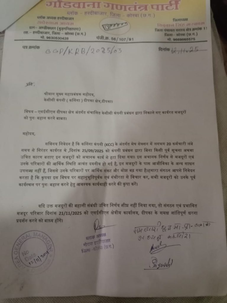 “यदि मजदूरों की बहाली को लेकर शीघ्र कोई ठोस निर्णय नहीं लिया गया, तो हम 21 नवंबर 2025 को एसईसीएल क्षेत्रीय कार्यालय दीपका के सामने शांतिपूर्ण धरना प्रदर्शन करेंगे।