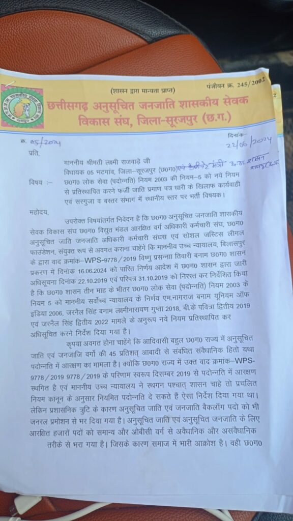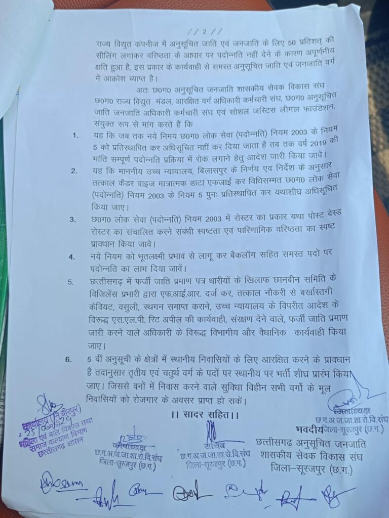 छत्तीसगढ़ अनुसूचित जनजाति शासकीय सेवक विकास संघ, जिला सूरजपुर (छ.ग.) द्वारा आयोजित कार्यक्रम में विधायक भटगांव और कैबिनेट मंत्री माननीया श्रीमती लक्ष्मी राजवाड़े जी को ज्ञापन सौंपा गया। इस ज्ञापन में मुख्यत: निम्नलिखित मांगें उठाई गईं: